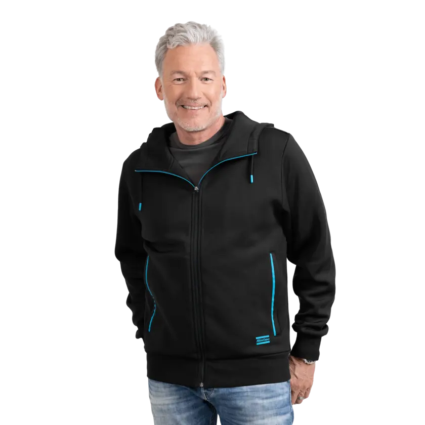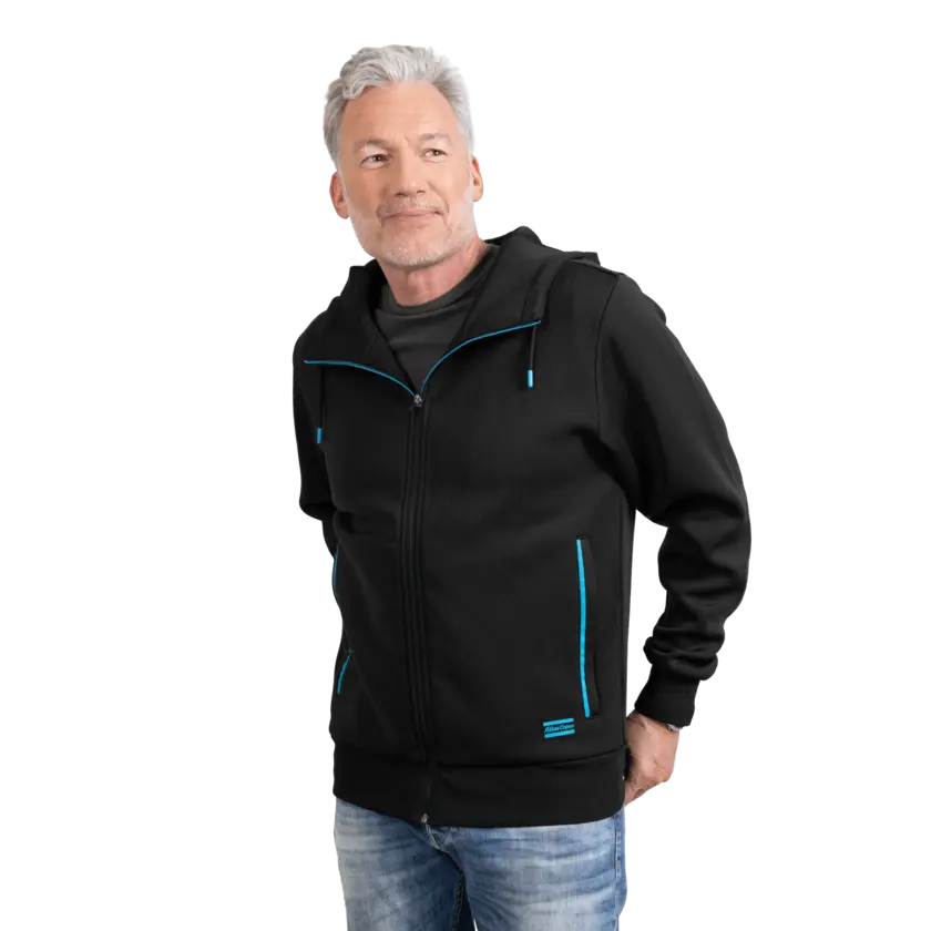 Contemporary hoodie with a full zip, featuring an exclusive design and an embossed logo on the back. Thoughtfully finished with contrast details in signature Atlas Copco blue for a distinctive and stylish look.