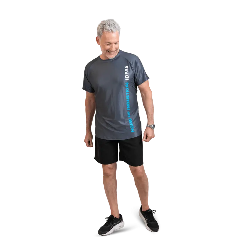 Made from a majority recycled polyester blend, this T-shirt is a stretchy, movement-friendly activewear staple perfect for both low and high intensity activities. Home of Industrial ideas slogan printed on the front.