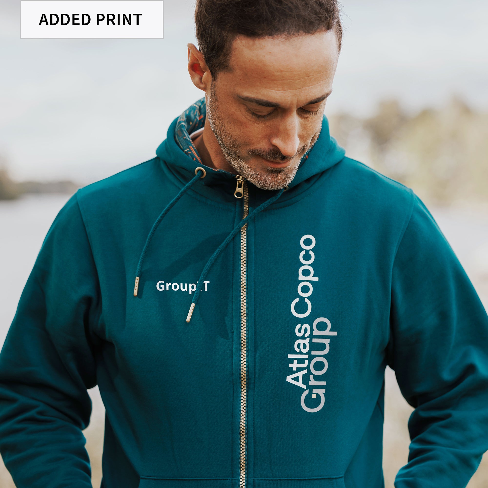 A hooded zip sweatshirt with a soft brushed terry cloth inner for ultimate wearing comfort. The color is contrasted against gold finish details and a printed logo on the chest for an elevated take on a leisurewear classic. Optional print possibilites added in cart.