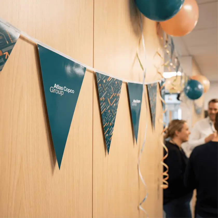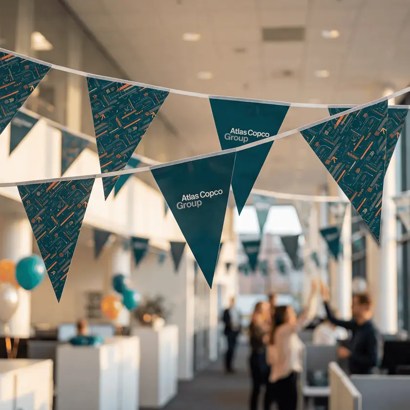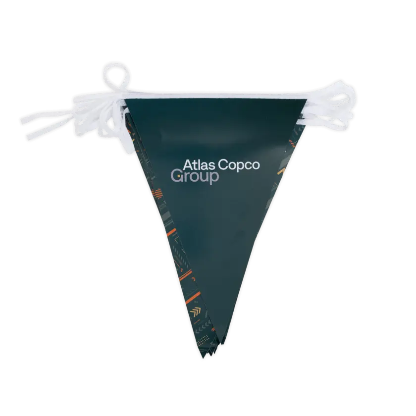 This triangular bunting is a classic way to create visibility and atmosphere at events, celebrations, or promotions. Each 5-meter string includes 20 pennants. Printed on both sides in full-color and sewn onto a strong white cotton webbing for a clean finish.